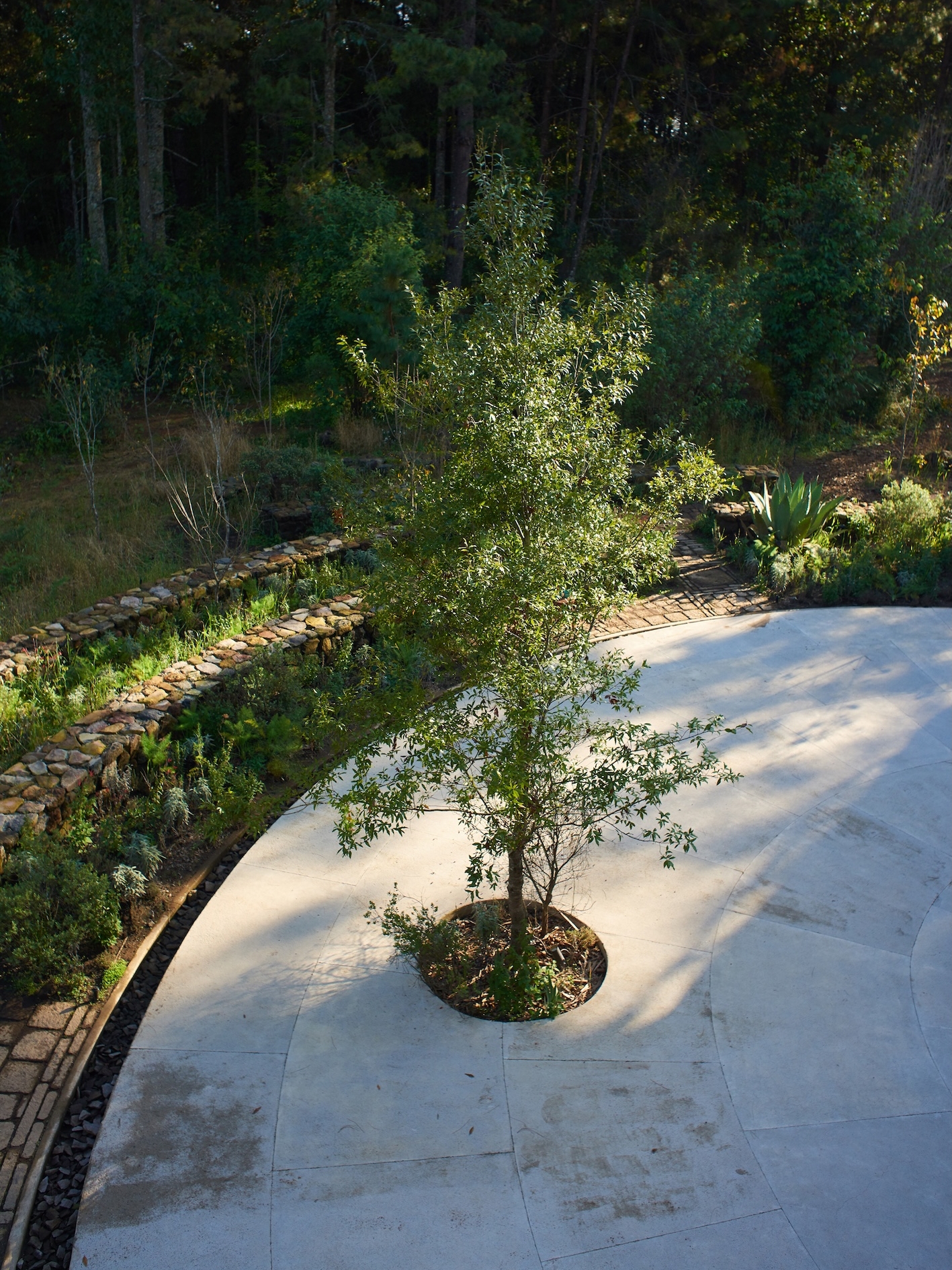 The circular water garden is overlooked by another circle, a semicircular house completed with a semicircular terrace. The rounded walls and paths between the house and pool garden were placed carefully with hand-cut stone, giving an impression of antiquity and encouraging their cracks and crevices to be inhabited by flora and fauna. The effect would be like finding a ruin-garden in the forest.