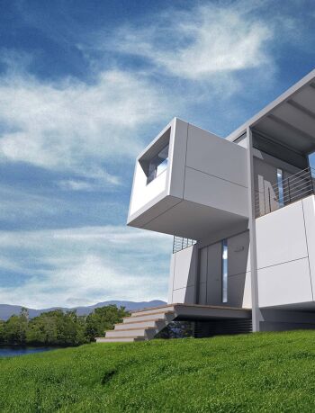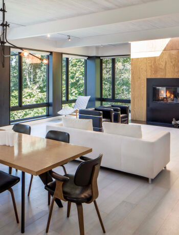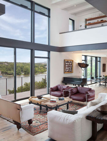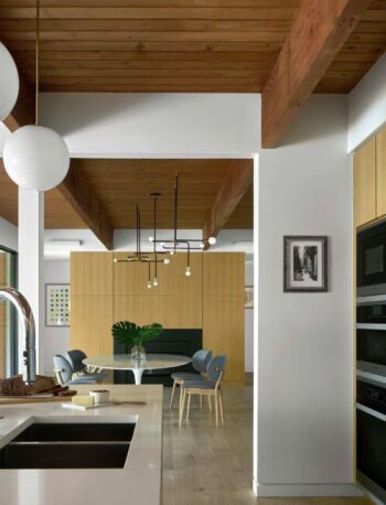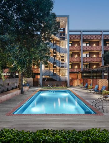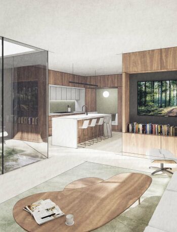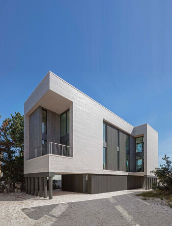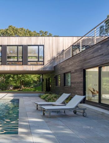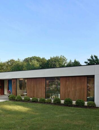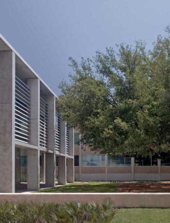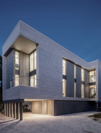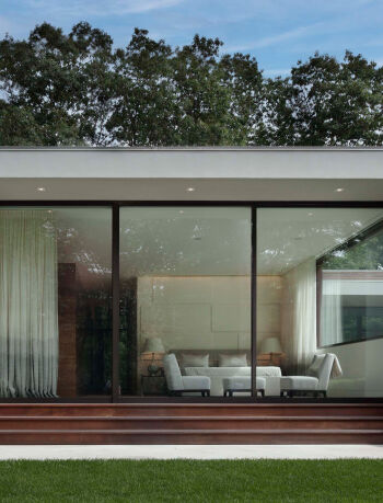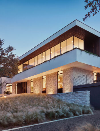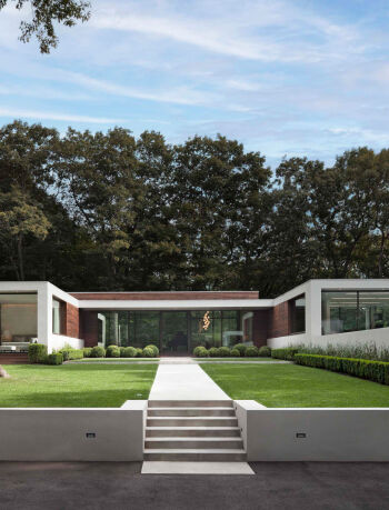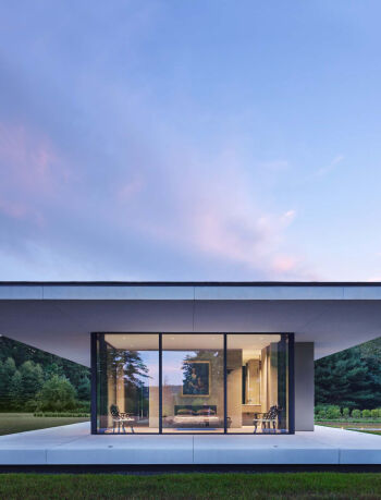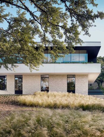 The Preston Hollow House blurs the lines between indoors and out. A floating pavilion roof hovers over the interior and exterior spaces while sliding glass panels and corrugated concrete walls define its courtyards. The house is open and light-filled yet provides seclusion from the street.