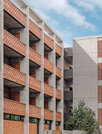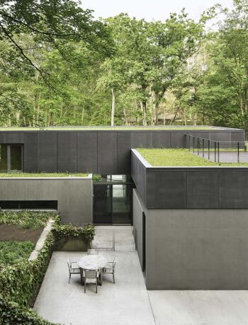 The concrete walls were cast using custom formwork that creates a corrugated appearance on one side while remaining smooth on the other. Unlike the brutalist architecture of the 1960s, however, the monolithic walls are countered by delicate steel columns, frameless windows, and flowing water.