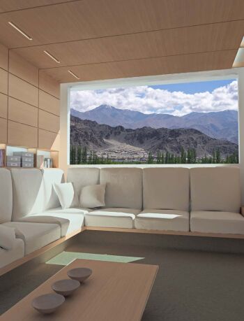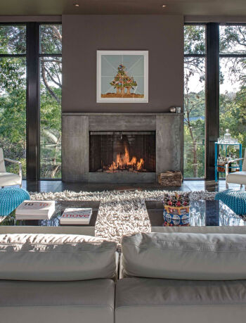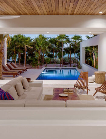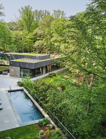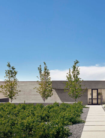 Water helps link the exterior and interior spaces. A narrow channel, punctuated by cascading terraces and a gentle waterfall near the main entry, flows through the house and into the swimming pool. At night, lighting within the stream casts changing patterns on the textured walls.