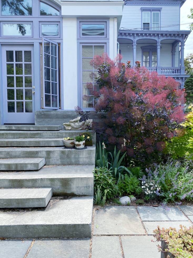 For Amy Ilias, a designer, and her husband Jim Denney, an artist, it took four years, to be exact, to finally tame and shape their backyard into what they wanted: a spacious bluestone patio—with ample space for relaxation, outdoor dining, and poetry readings—surrounded by a lush garden with native plantings that highlight the beauty of their mid-19th-century Italianate house and play well against its unique lavender shade.
