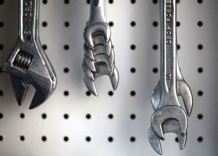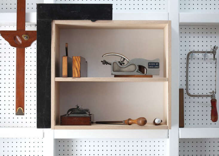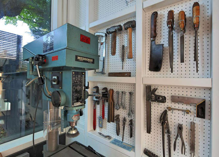 In addition to windows, the shed has two skylights. The pegboard wall panels allow Davidson to display (rather than merely store) his grandfather’s tools.