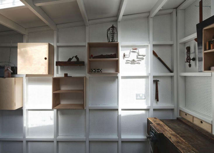 Above: The floor is concrete and the walls are lined with lacquered pegboard with hooks and open shelving to house tools.