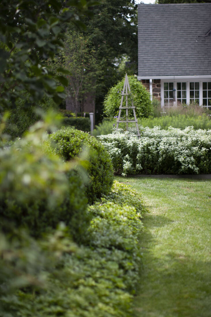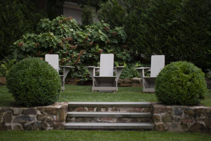 The quickest way to add formality to a wild-leaning mass of native plants is to insert a geometric or traditional garden decoration, like the sculptural tuteurs seen in Peterson’s garden. “A tuteur with a traditional clematis climbing up it brings it back and gives it that formality,” she says. Likewise, selecting more traditional outdoor furniture can formalize the overall effect.