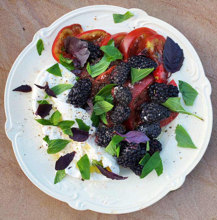 In my farmers’ market and forage-inspired versions of the caprese salad, seasonally shifting fruits and vegetables (and vegetable-fruits) provide contrast for the soft cheese, whether it is fall-apart creamy burrata, sliceable mozzarella, or assertive feta. I am looking for softness, for crispness, for a touch of sweet, and sour, and salt—and for fragrance. Preferably all in one mouthful.