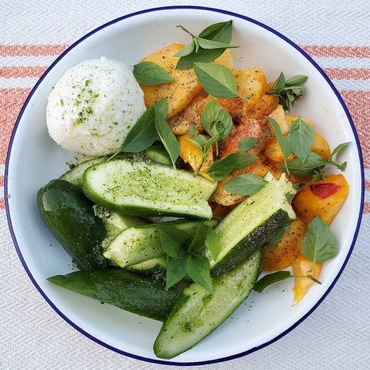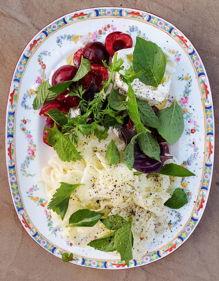 Tomato is a fruit. So why not deploy fruit-fruit, like cherries, peaches, and figs (yes, we know they are actually modified flowers), in a caprese? Pinches of good salt and freshly cracked black pepper offer an essential savory counterweight to the fruits’ sweetness.