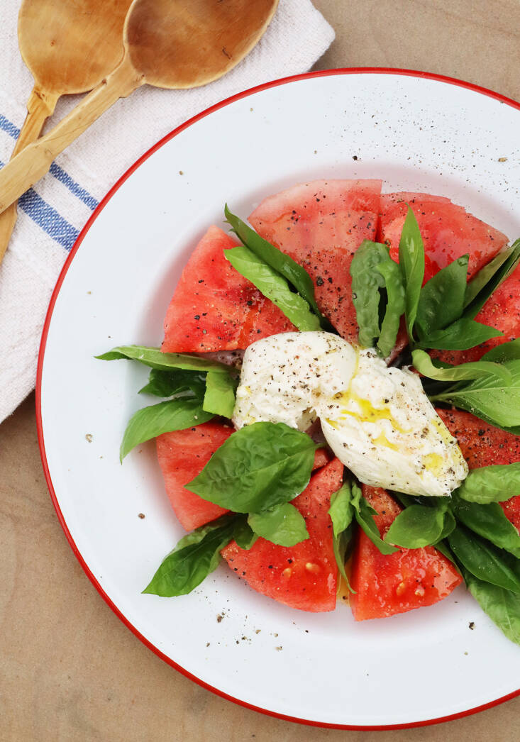 For peak watermelon season and ready in under 5 minutes (or as quickly as you can slice your watermelon and tear open your burrata), this exceptionally refreshing, simple salad is deeply rewarding to eat: Pillowy and crisp, creamy and sweet, and the pungent, sweet basil moderating every mouthful.