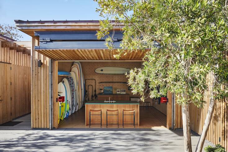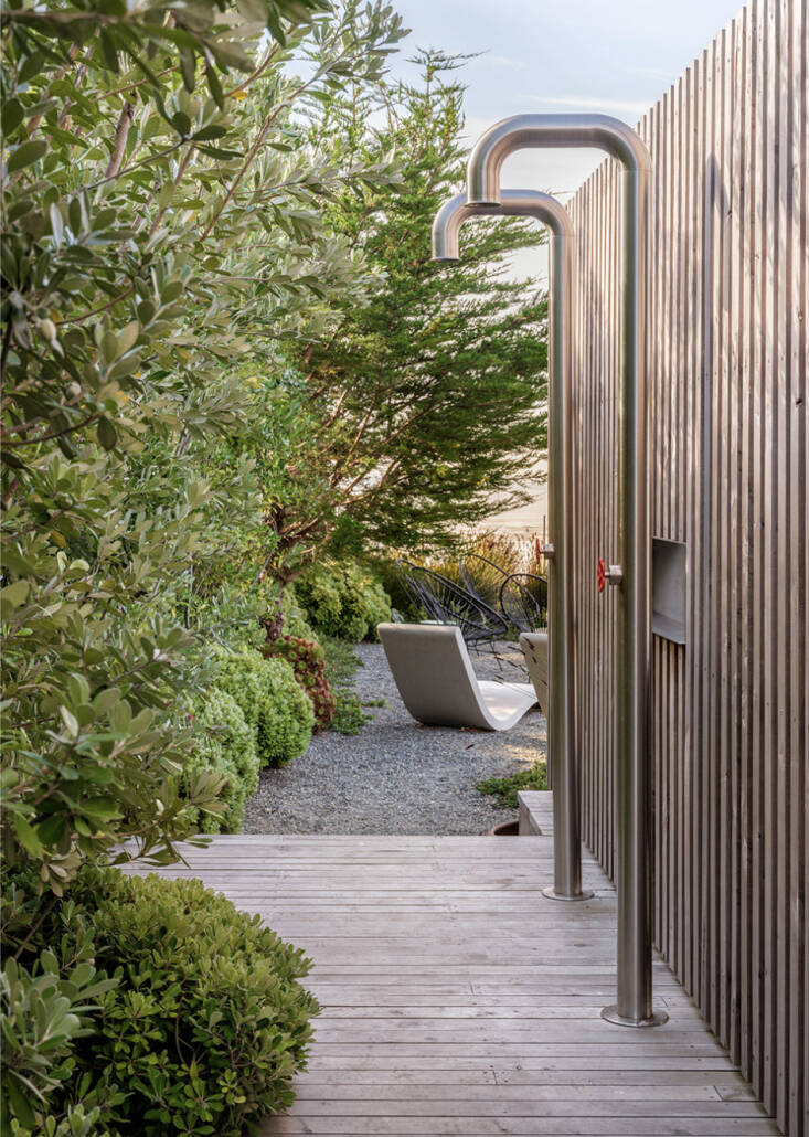 Ground Studio Landscape Architecture was brought into the creative mix to help integrate the home into its coastal site and enhance the dramatic views. Sheltered and hugging the coast, the landscape features a quilt of coastal plantings. According to founding partner Bernard Trainor, creating a casual feel actually requires a sophisticated design sense: “Designing a garden where the land meets the sea forces you to pay close attention to the resilience of the materials and how they can stand up to those weather conditions.” He says that no precious materials were used, only those with “industrial strength” to endure the climate and the surfer wear and tear from constant back-and-forth trips beween home and beach.