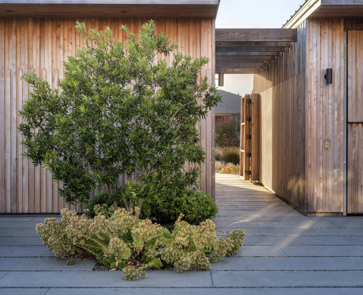 Feldman Architecture and Commune Design were enlisted by the clients to design a house that was “contextual without overwhelming the neighborhood,” but that would also work with the California Coastal Commission guidelines. With the aid of a local geologist, the project team studied the erosion potential to determine the building setback and then finally the placement and orientation of the home. The house gently unfolds across the property, with a design that emphasizes indoor and outdoor living, and the use of natural materials.