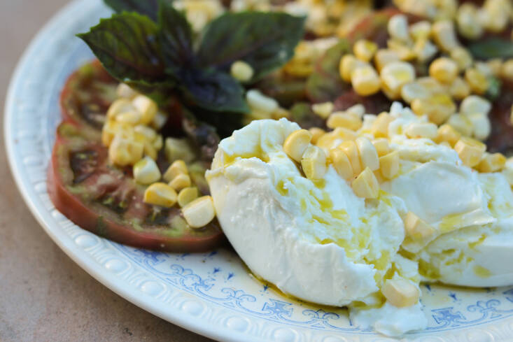 You need tomatoes, you need mozzarella (or burrata), you need basil, and you need extra virgin olive oil. What makes a successful insalata Caprese? Quality ingredients. But even hothouse-grown tomatoes can be improved by generous seasoning—this is no time to hold back on the salt. For the mozzarella, you can choose freshly-made (I buy mine from my Italian butcher in Windsor Terrace, Brooklyn, who makes it daily); this is a firmer mozzarella that needs a very juicy tomato. Or you can go commercial and domestic—choose mozzarella or burrata in brine; they will be more moist and plump. Or look to Italian-made mozzarella and burrata for extra tenderness and cream; the softer, brine-coddled cheeses can accommodate and envelop more acid, especeially in slightly underripe tomatoes.