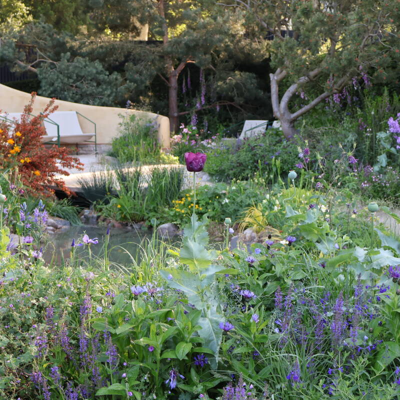 In the UK, beavers are being reintroduced to landscapes, especially those which are undergoing a process of rewilding. This show garden is edged with long grass and hazel wattling, with a bridge of planks over a dammed stream and unruly piles of twigs and branches. The style takeaway of the hideout building (for nature-watching) is a corrugated roof and rough-hewn wooden walls. In his garden column for the London Times a few days ago, the TV presenter Joe Swift asked whether this was more of a recreated landscape than a show garden. What do you think?