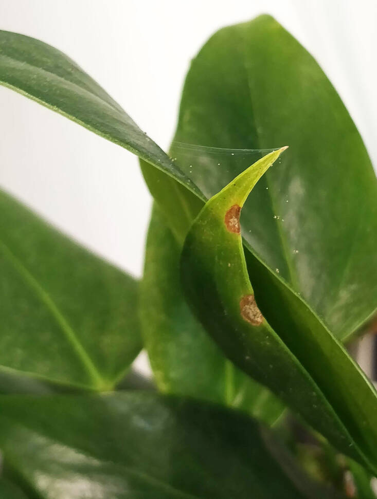 Fine cobwebs on your indoor plants might be the innocent traps created by a harmless indoor spider (these webs are beneficial for trapping fungus gnats), but they might also indicate an extremely common indoor plant pest: the spider mite, a tiny arachnid whose needle-like mouth parts pierce plants as they feed on sap. If you manage to see a web backlit, you might spot the miniature creatures moving back and forth on it. Also check the leaves, says Darryl. “Their eggs and first level instar [they only have six legs versus the eight of the adult] remnants remain on the plant, especially on a vein or in a crevice, resembling grains of salt.”