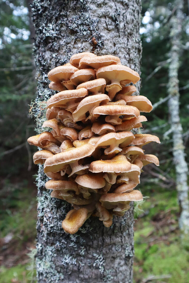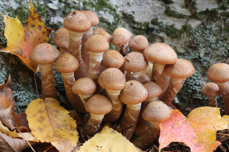 Honey mushrooms, abundant and edible and fruiting in fall, are the forager’s motherlode. They tend to grow in very generous clumps. Despite their moniker, they are not sweet, but taste nutty and, well, mushroomy. Their slippery-on-the-tongue texture is appealing, especially if you pair it with the quick crunch of foundational toast or the longer slurp of a slithery noodle, or blend it into a smooth-as-silk pâté for your next picnic. In Eastern Europe honeys are a prized edible. Not so much in North America. As to their nature, that is none too sweet, either: Honey mushrooms are killers, and dramatic slayers of trees.