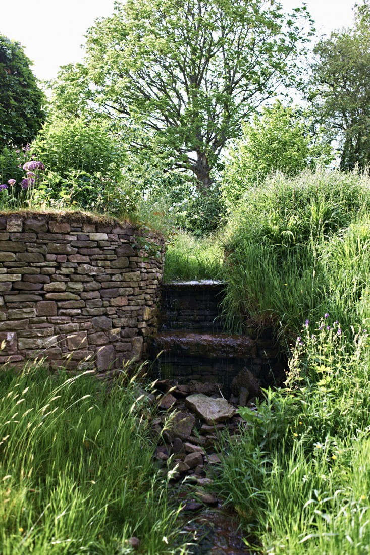 Above: The small stone waterfall adjacent to the upper perennial and kitchen garden.