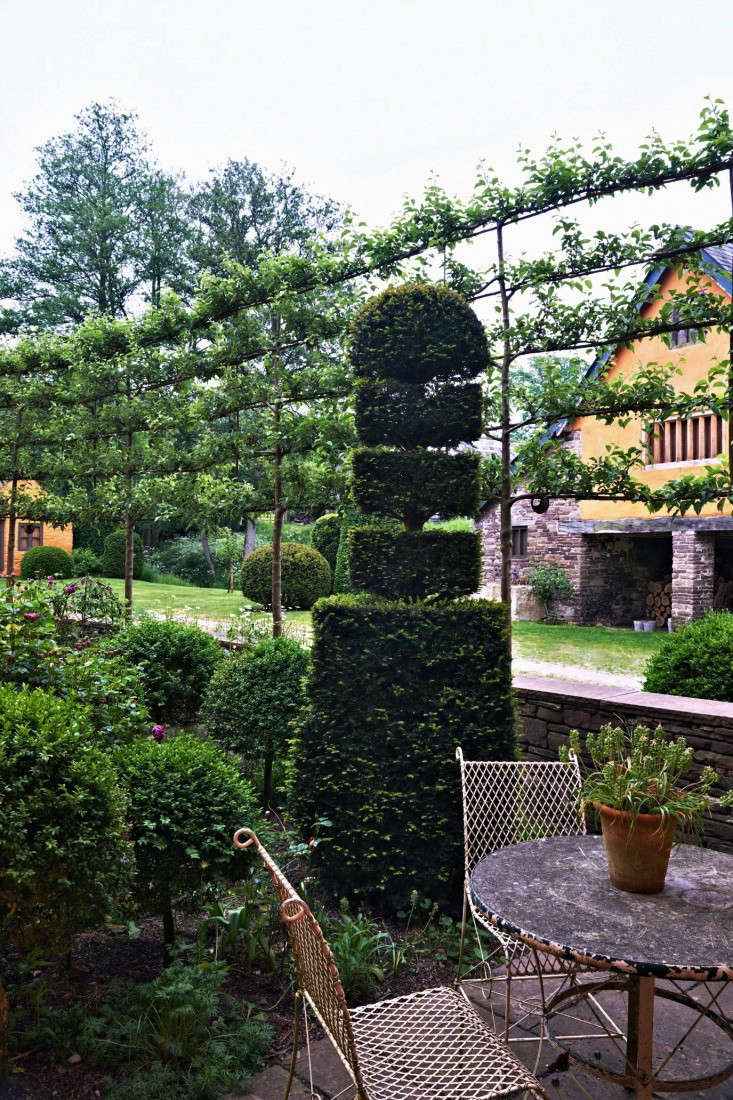 Above: The enclosed garden by the kitchen door makes for an welcoming entrance. Espaliered crabapples fence it in to form an intimate spot for afternoon tea. Whimsical topiaries, Arne’s signature gesture are like charming waiters attending to your needs.