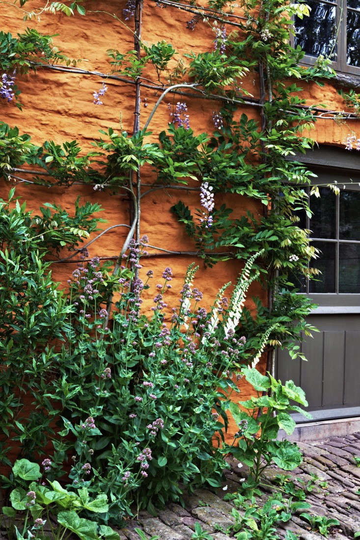 Above: Wisteria is trained on the side of the house. Foxglove jets out of the paving.