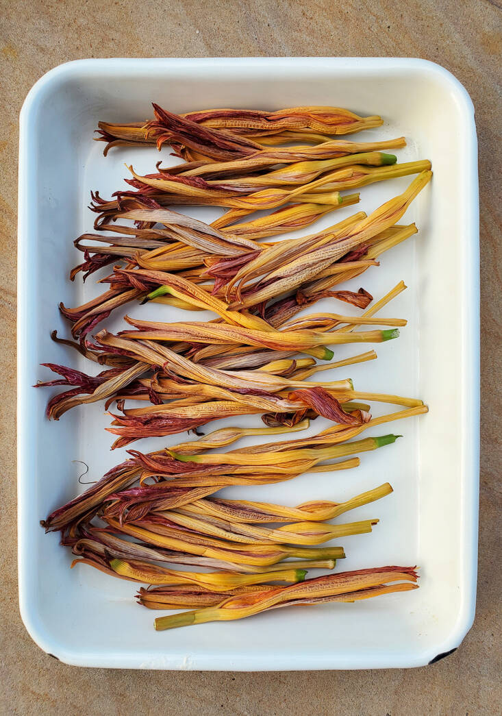 Otherwise, if your daylily patch is substantial (Hemerocallis fulva is invasive in North America), collect fresh, open flowers. They will fold within the day.
