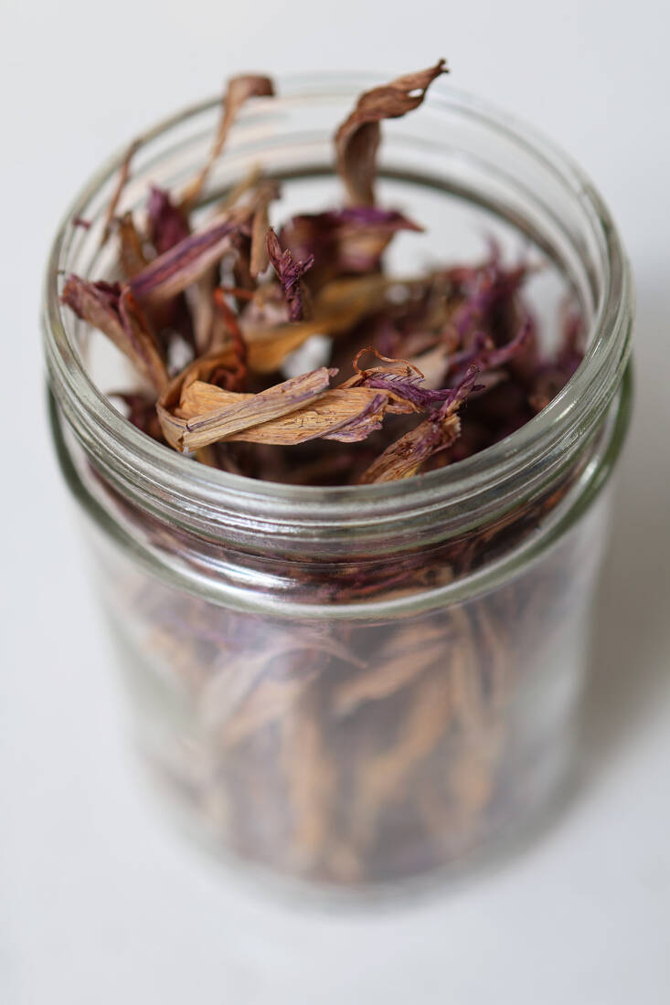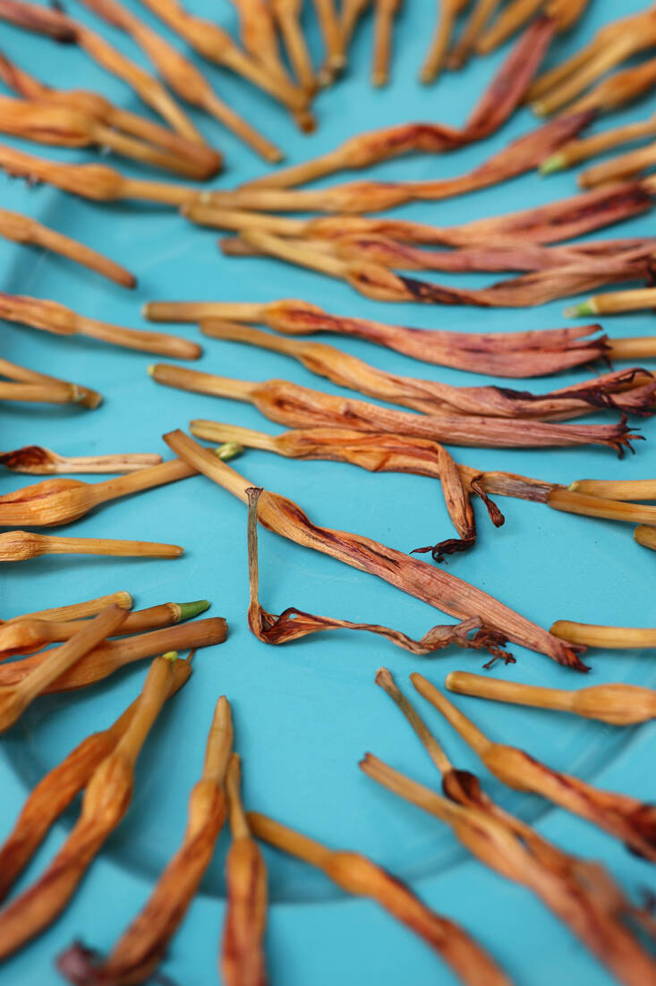 To dry daylilies, arrange the spent flowers in a single layer on parchment or cloth, or on a baking tray or large clean platter. Turn them once a day. When they feel paper-dry, usually after about a week, transfer their narrow, brittle forms into a jar, and close the lid very tightly. When you open that lid again give them a good sniff. Carob! They last impeccably in an unopened jar for (at least) two years.