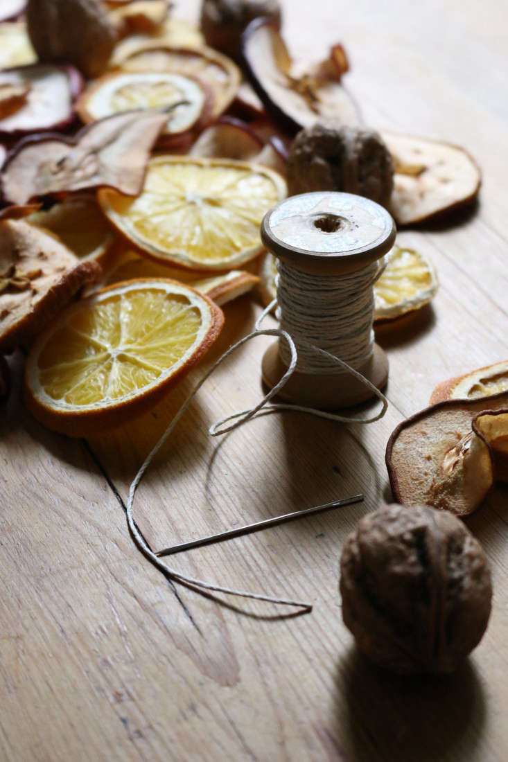 6: Use an upholstery needle to thread the dried fruit onto thin twine.