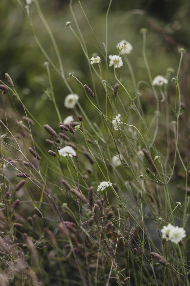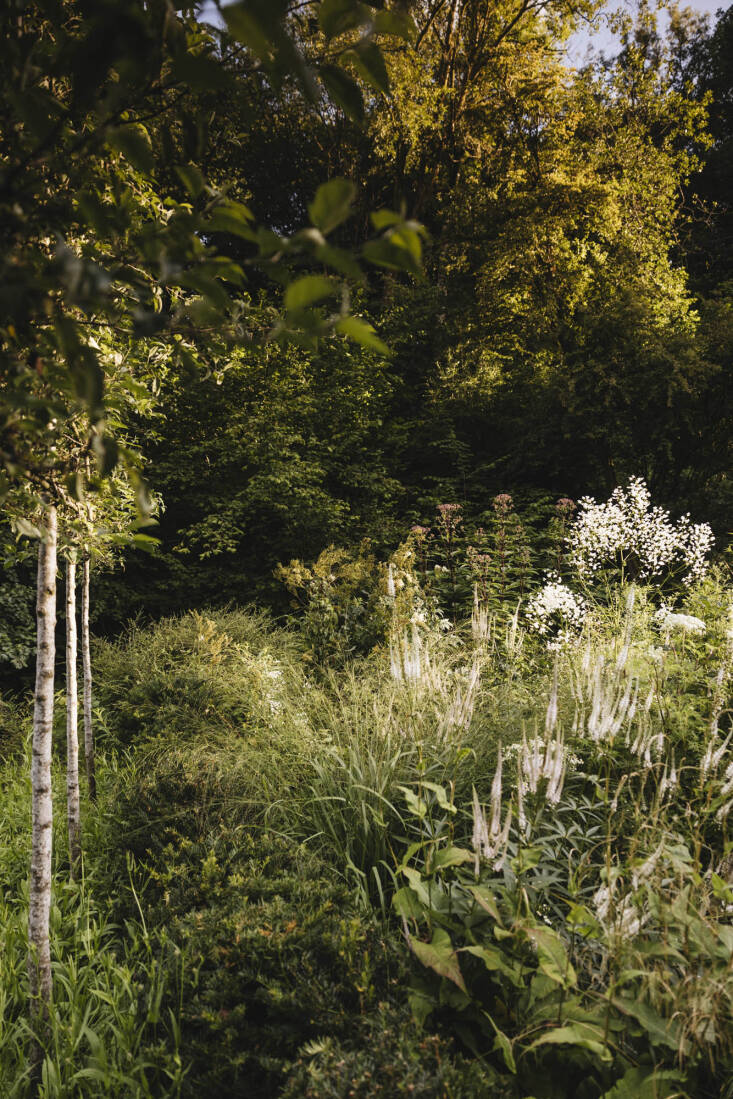 Deep and immersive herbaceous borders spill out across the front of the house, but the color palette is subdued in pale yellows, cream, and white. Eupatorium, thalictrum, asters, and foxgloves are contrasted with ornamental grasses including Molinia ‘Transparent’. The whole effect is elegantly understated, with just an occasional jolt of color from a vivid red Hemerocallis or Echinops bannaticus ‘Taplow Blue’. Earlier in the season there are Sibirica irises (including ‘Papillon’ and ‘Perry’s Blue’). Wild self-seeders including Achillea and ribwort plantain are welcomed along the edges of narrow paths.