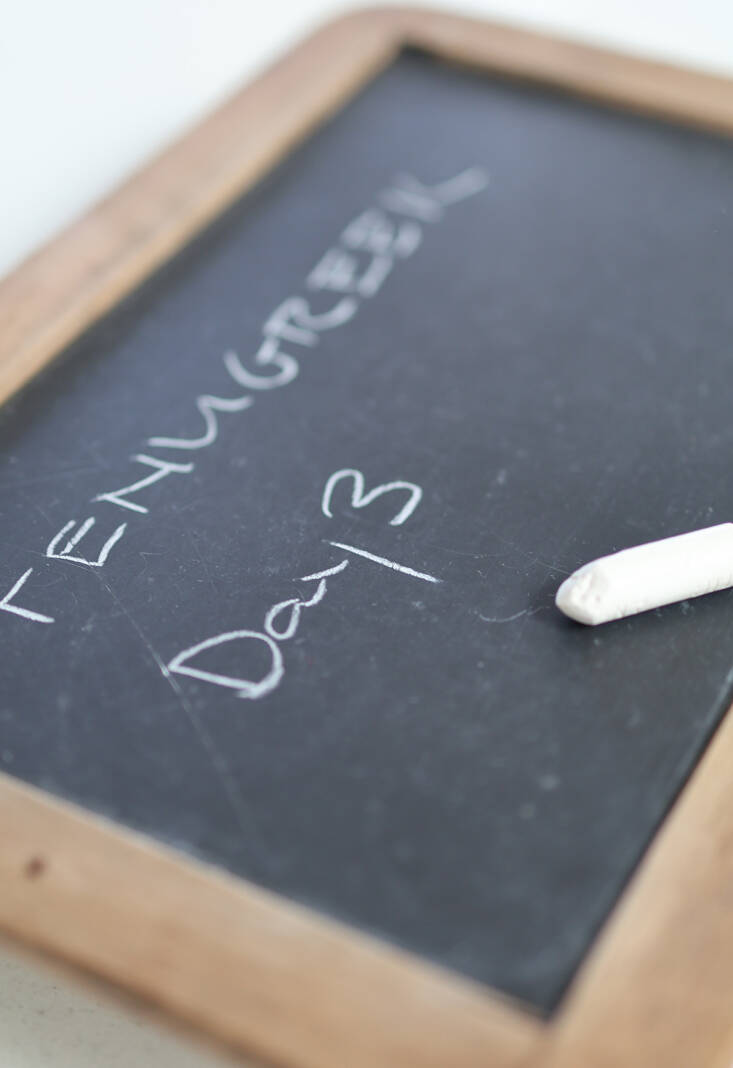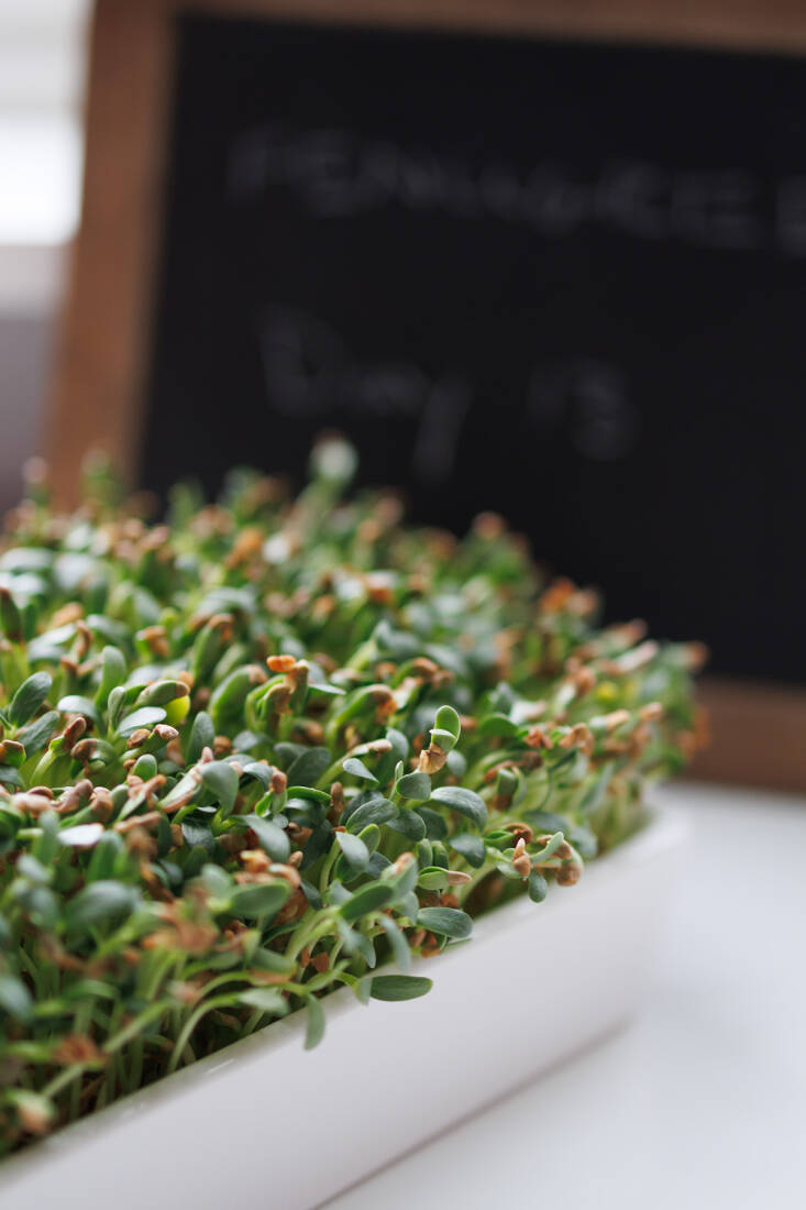 I use a small vintage school slate (found on Etsy—they also make great shopping lists, hung at our front door) to cover my tray, but a piece of thick cardboard cut to fit works just as well. It helps to write the date, or number of days, on the cover, to keep track. Expect the microgreens to be ready for harvest around Day 12 to 14.