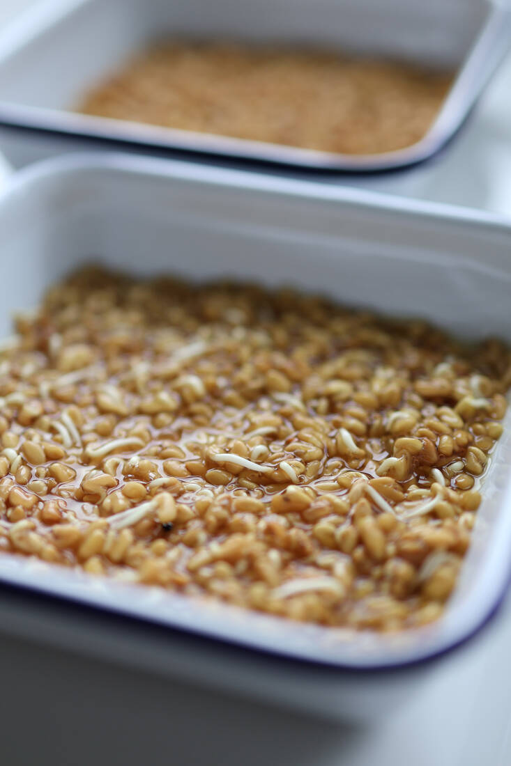 The seeds are soaked, covered for three days to create a dark environment, and then uncovered and placed somewhere bright. You only add water when it threatens to dry up, keeping the sprouting seeds very lightly moist. As to where to find fenugreek seeds for growing the microgreens, I have been very lucky with store-bought spices—100 percent germination rate, in fact, which surprised me. They are also available online especially for sprouting.