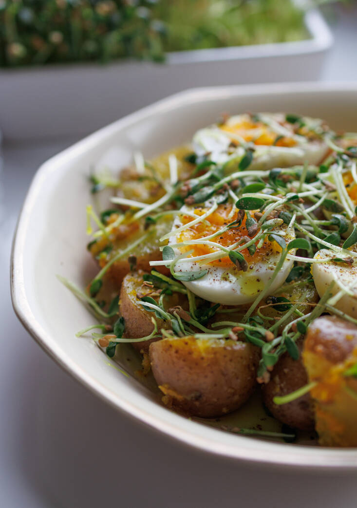 And it is with potatoes that I like to deploy my own microgreens: warm baby potatoes, eggs, and a vivid turmeric butter. The fresh greens add their powerfully sweet aroma along with their much-appreciated and distinctive trace-bitterness to a plate that brims with functional food goodness.