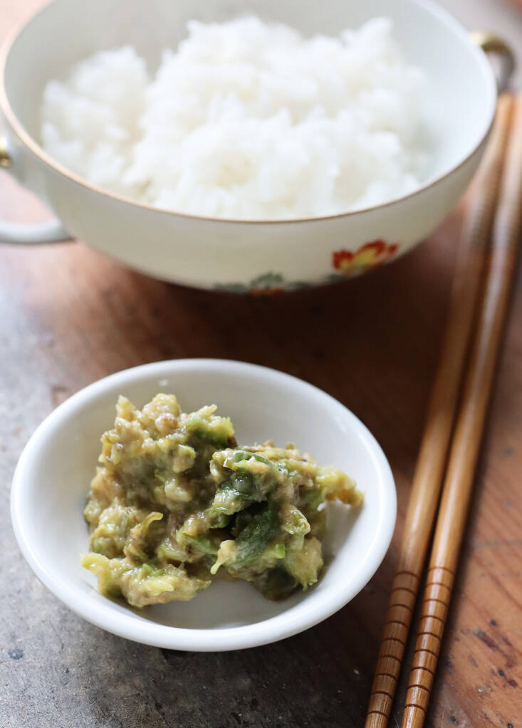 The fragrance of fuki buds is enhanced by salty miso and the sweetness of mirin with a touch of vinegar. Add a dab to a bowlful of steamed sticky rice, or swipe the paste across grilled fish, just after cooking. I soak fuki buds overnight in a large bowl of water before proceeding with any recipe.