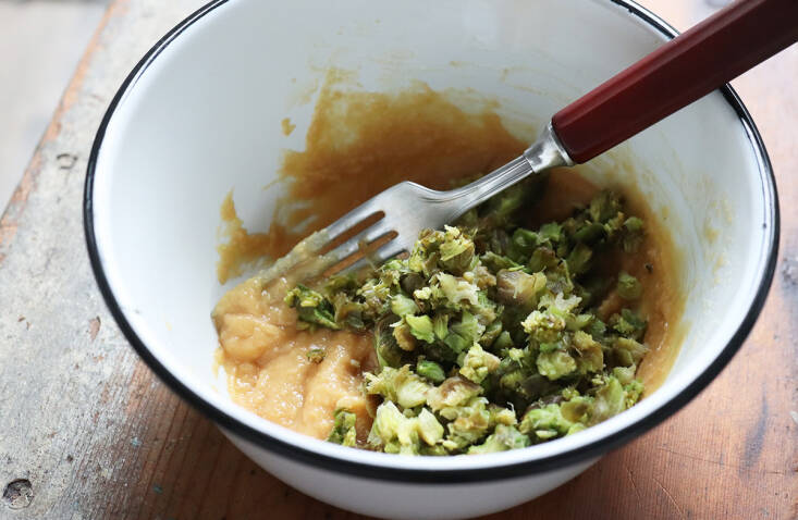 Trim any darker sepals from the buds, if necessary. Bring a pot of water to a boil. Drop in the trimmed fuki and cook for 4 minutes, until tender. Strain, discard the vivid-yellow cooking water, and dunk the buds into a large bowl of cold water. Leave until they are cold, then roll them up in an absorbent kitchen towel and squeeze gently to remove excess moisture. Chop the buds up roughly.