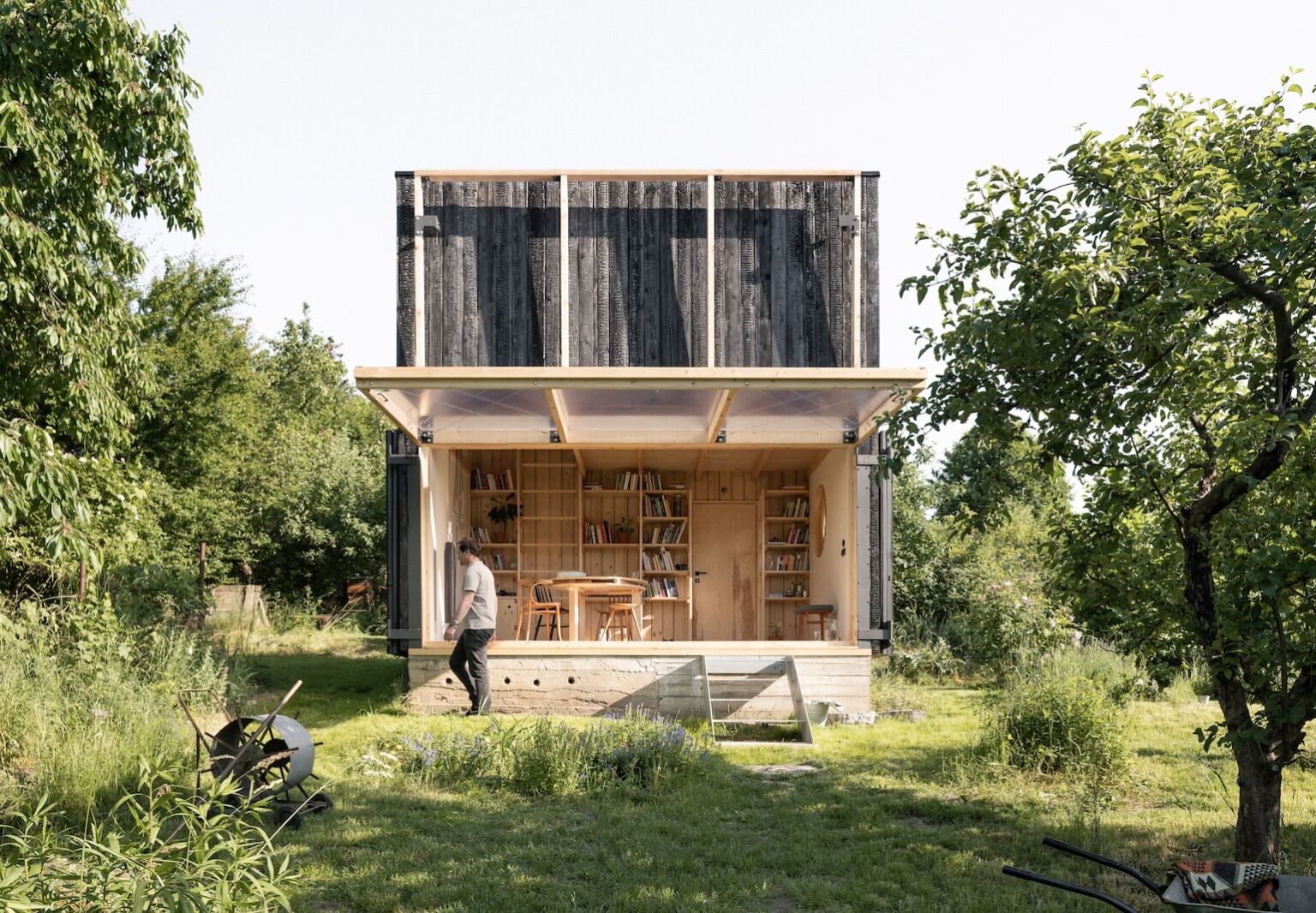 To tick all those boxes, architects Jan Holub and Tomáš Hanus devised a pavilion with built-in bookshelves, a sleeping loft, and a façade that pops up to fully connect indoors and out. It’s a practical folly.