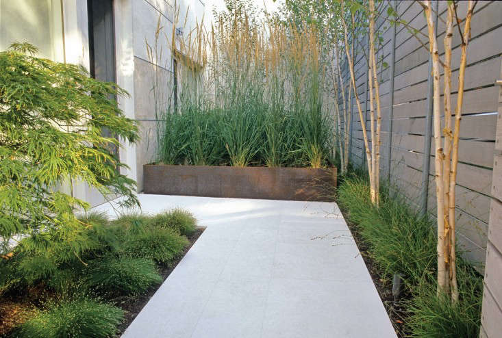 Above: The same view at ground level: tall, spiky perennial grasses in a Cor-ten steel planter.