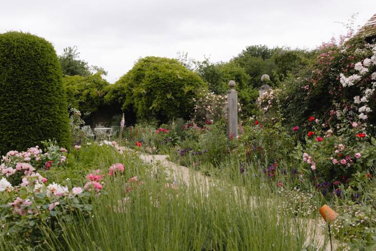 Horizontals of yew hedging provide tantalizing glimpses of the effusive garden on the other side. Romping over a shop-bought frame (from Harrod Horticultural) is the notoriously vigorous rose R. Mulliganii, usually seen in Sissinghurst’s White Garden (and shown here at three-years old). “We planted one of the fastest-growing roses I’ve ever seen,” says Isabel. “And because we’re always in a hurry, it’s brilliant.”