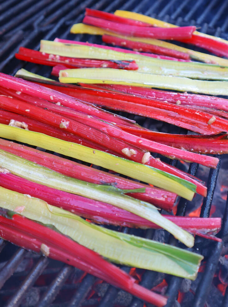 For cooking over coals: Wait until your charcoal is red with a fine layer of ash. Remove the Swiss chard stems from the marinade* and grill them until they take some color on each side, about 2 minutes per side.