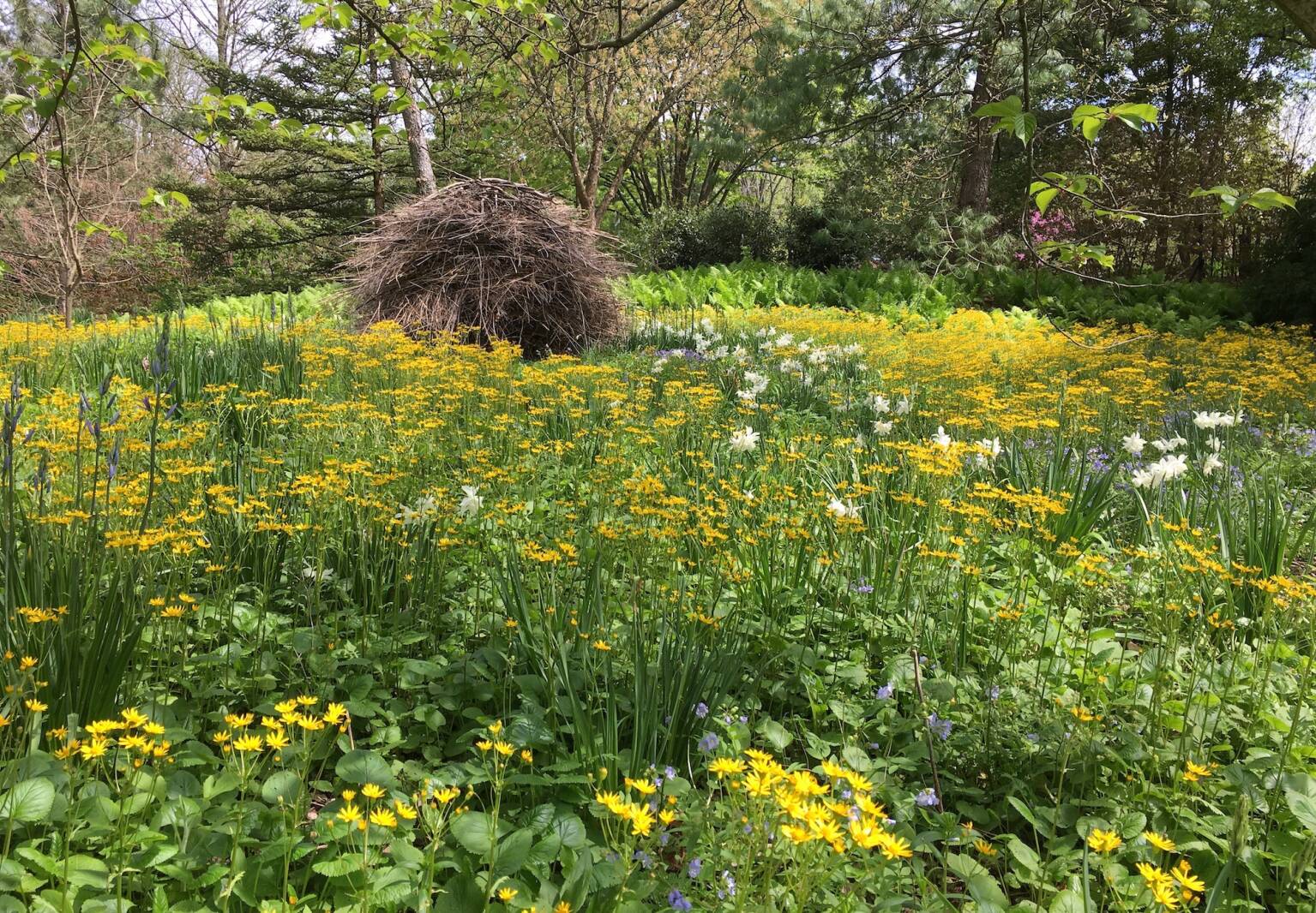 At Chanticleer garden in Wayne, PA, assistant horticulturist Chris Fehlhaber constructs a habitat pile each year after the meadow is cut back in early spring. (He waits as long as possible to cut back the meadow with a scythe to allow for overwintering insects to emerge.) To craft the stack, Fehlhaber drives a wood stake in the ground and builds around it so that it’s sturdy and strong. “I start by creating a level base and then work around the pole in either a clockwise or counter-clockwise rotation to ensure there is plenty of overlap for strength, stability, and balance,” he says. He continues the process until all the material is used. “Then, I gather woody debris from the previous year and ‘top’ the stack with it, arranging the branches on top to create a well-balanced dome, which helps weigh the top down and sit it neatly around the pole.”