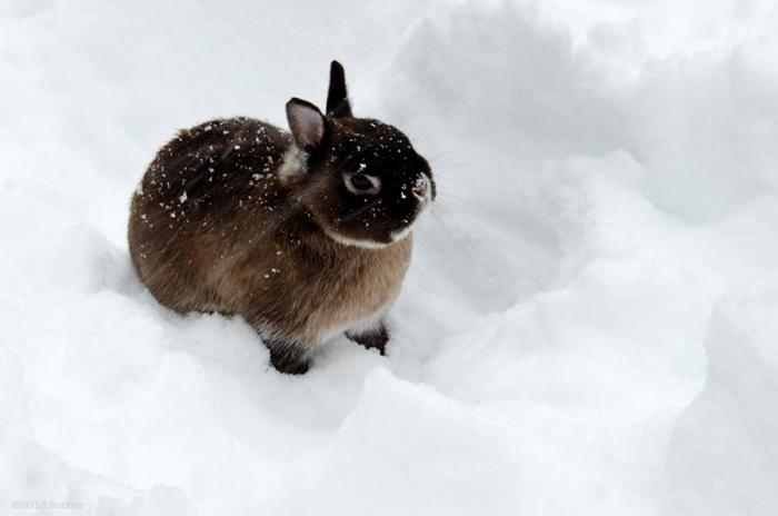 Above: OK, not a native Maine rabbit. But Jenn’s daughter’s Netherland Dwarf bunny, Shilow, captured enjoying the same storm, was so cute we had to share.