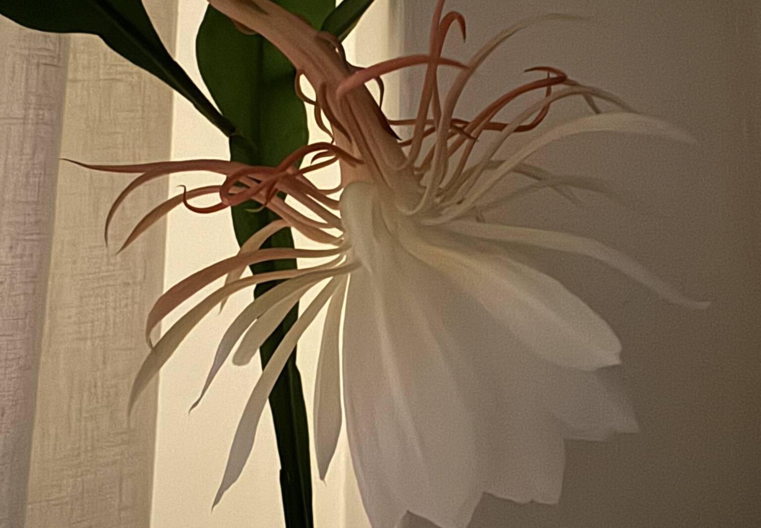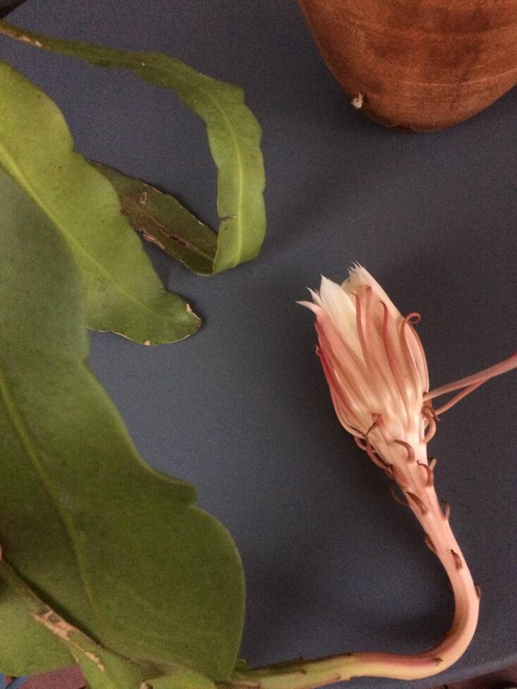 Night-blooming cereus, also known as queen of the night (Epiphyllum oxypetalum), is an epiphytic, spineless cactus. Native to Mexico and Guatemala, it is pollinated by nocturnal bats and moths and grows quickly and easily, sprawling as it spreads. It grows outdoors in warmer climates, like Los Angeles. But since I live in New York City where temperatures dip below freezing, I have mine in a pot on my windowsill. My plant was a gift from my sister-in-law Nicole, who gave me a cutting from her plant, which was a cutting from her mother’s plant, which came from a cutting of a plant from her mother’s late friend, who used to breed orchids in his basement. Needless to say, it propagates easily.