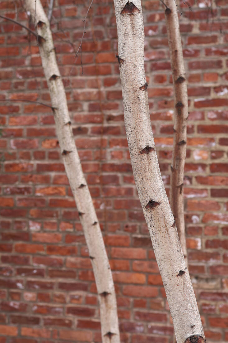 The restrained palette of trees is limited to birch, sassafras, and redbud. Beneath them shrubs include Japanese kerria and sweetspire, for spring and late summer bloom. Hellebores appear in late winter and the flower clusters of Skimmia follow soon after.