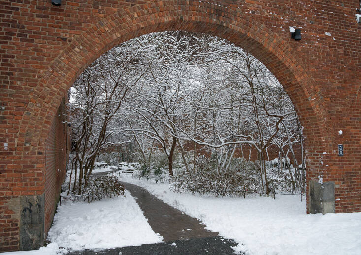 Near double swing-doors, a mature sassafras branch extends a gracefully welcoming arm, the theatrical winter expression in keeping with the entrance to St. Ann’s Warehouse within the garden