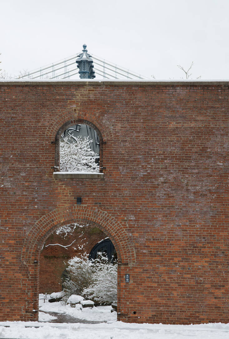 The two-floor brick shell that encloses the Max Family Garden is what remains of the original structure, and was commissioned by St. Ann’s Warehouse to fulfill zoning regulations that require new waterfront development to include publicly accessible green space. Both an entrance to the theater and a backstage door open into the garden.