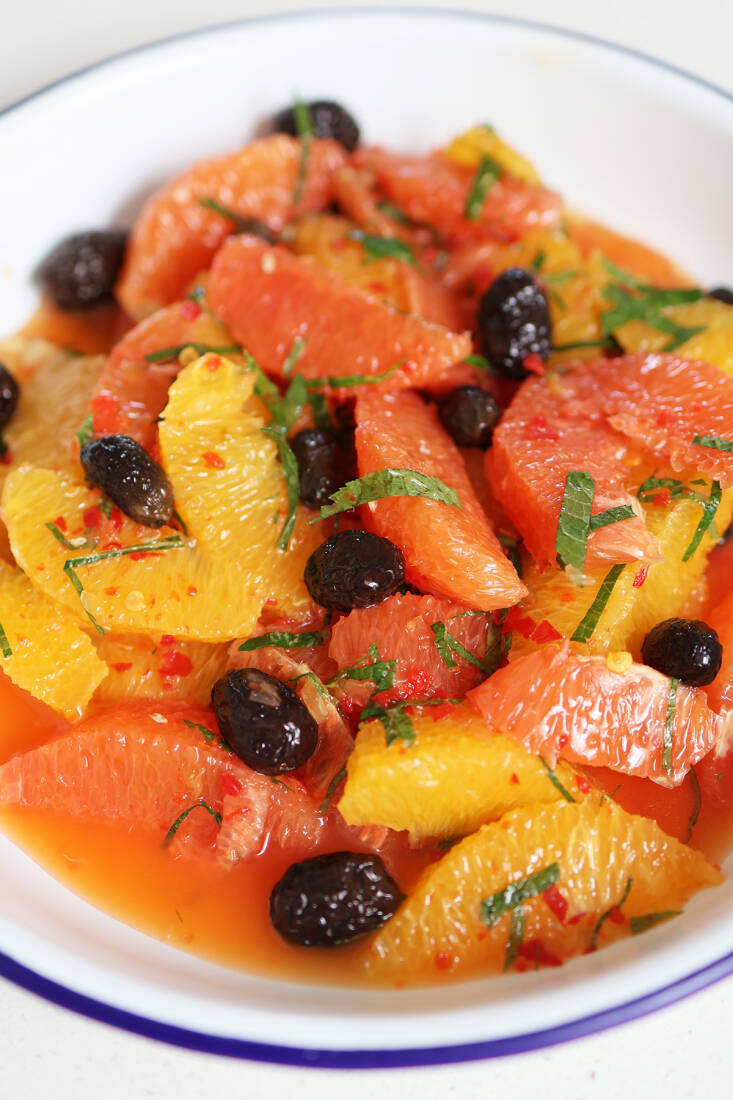 The other indelible memory is from Café Gitane, an indefatigable restaurant in Manhattan’s Nolita, where, ten years after that light night snack, I ate for lunch a startling salad of orange segments, oil-cured olives, and chile. It was served with a hunk of baguette, whose purpose was to sop up the complicated-tasting and soupy juice at the bottom of the bowl. I have made that salad ever since, recently with shatta as well as some mint, from our little terrace. The addition of house-cured olives makes it an even more satisfying pleasure.