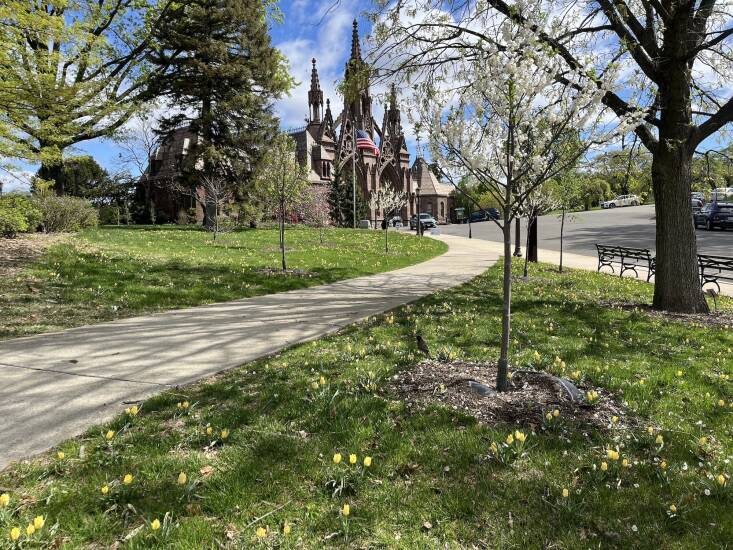 Much of the beginning of Joseph Charap and Sara Evans’s lecture about their innovative practices at Green-Wood Cemetery was about meeting the cemetery’s canopy loss. Charap and Evans point out that, too often, as older trees reach the end of their lives, there are no other trees in line to take their place (in both domestic and public landscapes). The team at Green-Wood is planting young trees on a massive scale, mostly bareroot because they are cheaper, easier to plant, and more successful than other young trees. They are also babying their oldest trees by creating root protection zones and branch props for aging limbs. It’s a two-pronged approach that any gardener could copy.