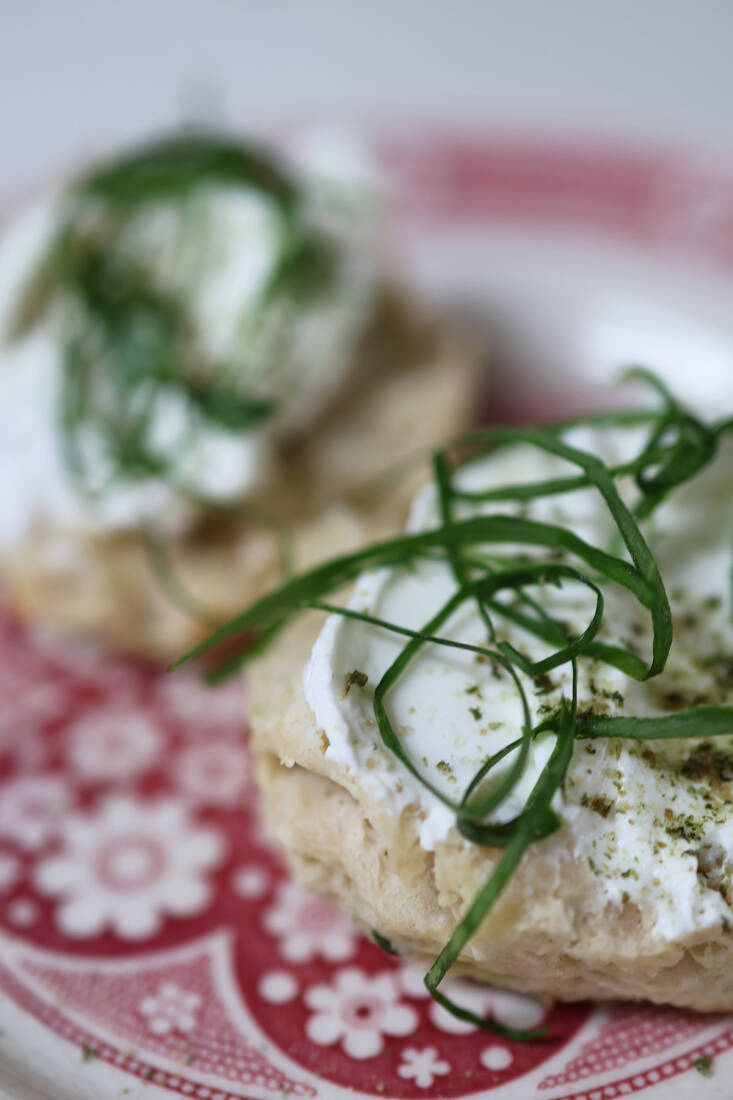 Top the ramp leaf biscuits with butter, with labneh, or with Greek yogurt. I add ramp leaf salt. Ham or prosciutto, and goat cheese work beautifully, too.