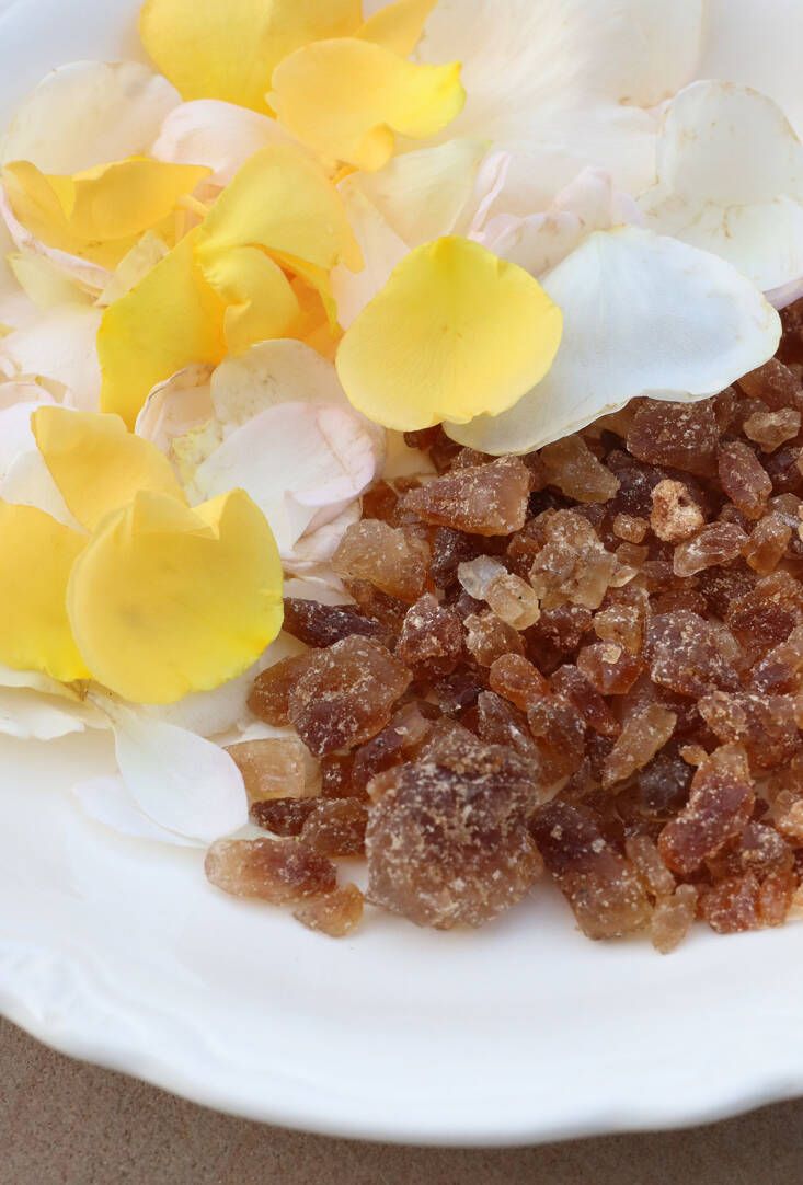 Riffed from Liz Knight’s recipe for Rose Petals Macerated in Sugar (which layers petals with sugar), my version of gulkand—a cooling tonic in Ayurveda—relies on palm sugar candy and the fragrant blooms I glean from our terrace shrubs. The candy is pounded in a mortar before the petals are added, and then the mix goes into a jar that is left in the sun for a couple of weeks before being stored in the fridge.