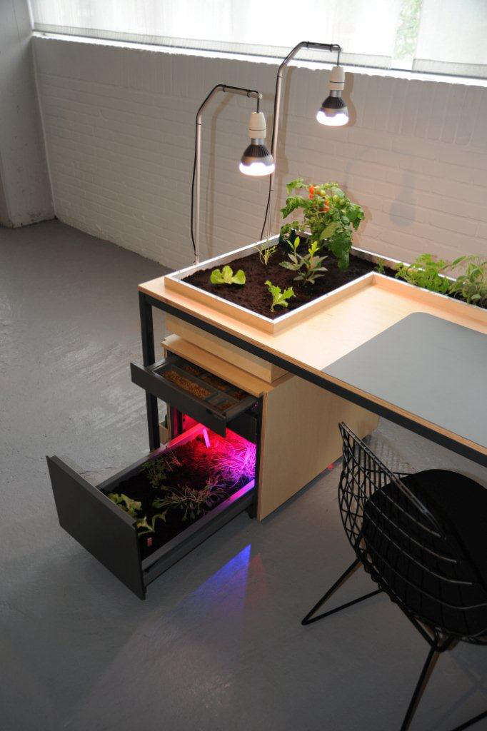 Above: Sybrandy and Wand designed Desktoop, a desk that does double duty as a mini farm. Developed as a prototype in conjunction with the Utrecht Manifest No.4, the biennial for social-design; Desktoop is currently being tested by the Agricultural University of Den Bosch and Philips LED.