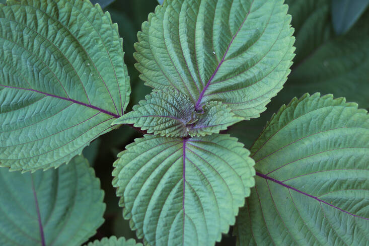 Perilla’s many common names can become confusing. But both subspecies of aromatic Perilla frutescens grow very well in shade. Sesame leaf (beefsteak plant, Korean shiso) is Perilla frutescens subsp. frutescens and can be purple or dark green, with neatly toothed leaf-edges.