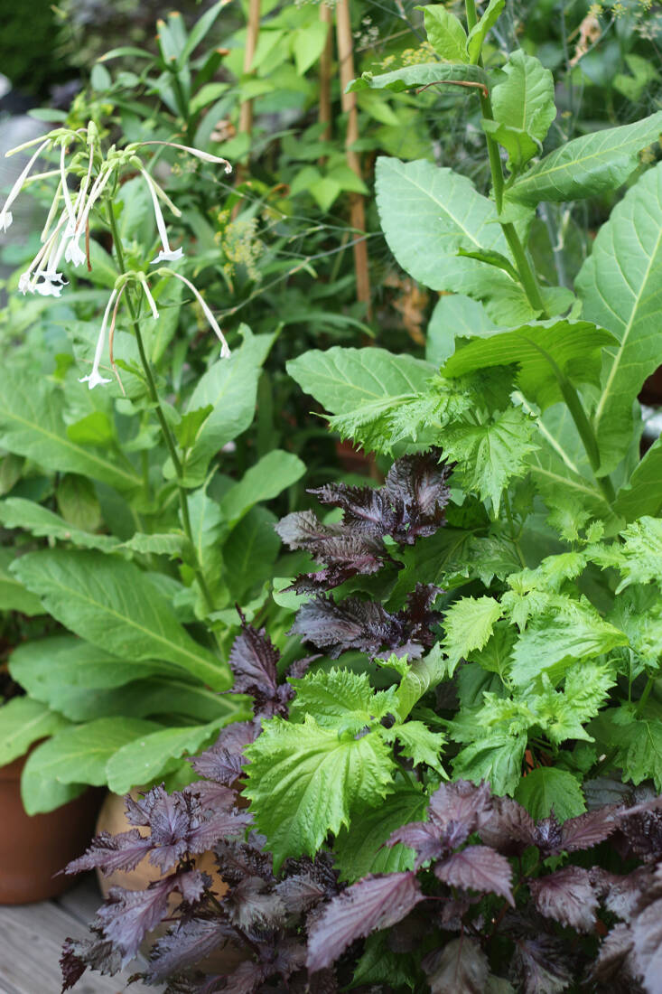 I grow sesame leaf and shiso in pots. Both thrive in warm temperatures and do well in both full sun or full shade. By late summer they are tall, and in early autumn they flower. These mint-family members are very attractive to pollinators. Both shiso and sesame leaf have invasive potential and have naturalized in the US, so it’s good idea to harvest all the flowers before they set seed.