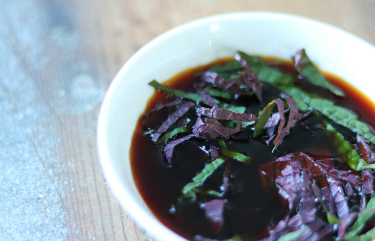 Fresh shiso makes a wonderful raw leaf wrap, folded around bites of a spicy filling, pickled vegetables, or slices of soy-grilled shortrib—a fresh foil for strong flavors. Shiso is also sweet and citrusy in salads, and complements stone fruit very well. I often sliver it into cake batters that include peaches or apricot. Purple shiso leaf is used traditionally to color umeboshi. (See: Umeboshi: A Traditional Japanese Pickle to Make at Home.)