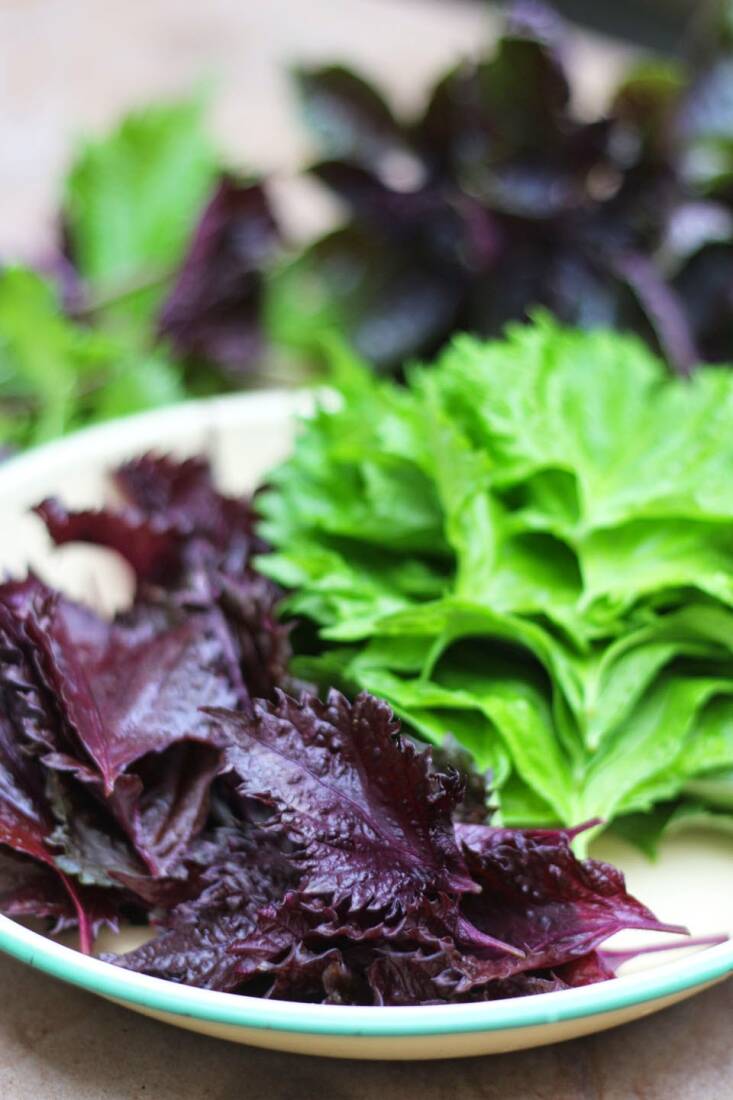 What’s in a name? If it’s two varieties of Perilla, potentially a lot of confusion. Even growers and trusted internet resources (I’m looking at you, Wikipedia) get them wrong, muddling images of shiso and sesame leaf (also called beefsteak plant). These different but very similar varieties of Perilla frutescens are both commonly eaten in East Asia. Stateside, they are sometimes referred to simply as perilla, their genus name.