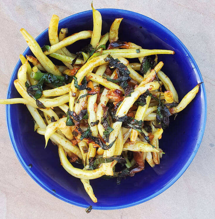 This humble and homely bowl of summer beans with shiso or sesame leaf pickle features a riff on the method for Korean kkaenip jangajji (sesame leaf pickle). To make it I use the more tender leaves of either herb, but if you use mature leaves they will need more time in the soy to soften. They turn limp and soft but their distinctive rosewater flavor holds its own. I often add this bean dish to a skillet of curry-dusted roasted chicken or pork chops, but it is very satisfying on its own.