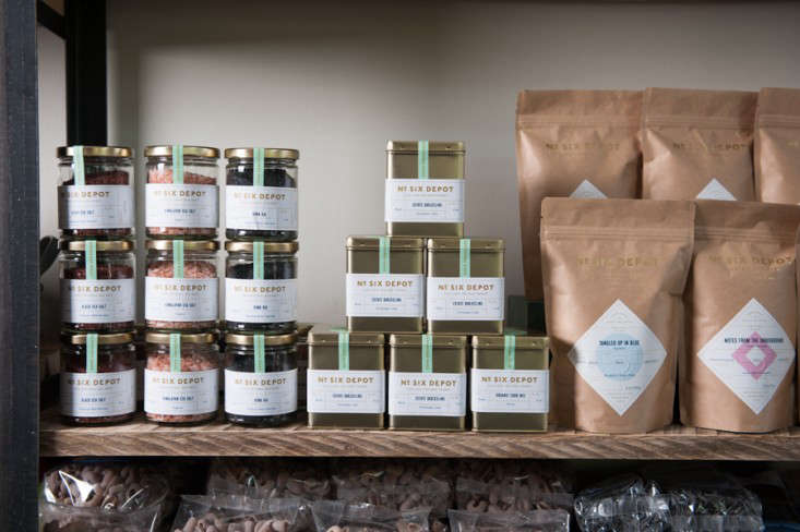 Above: Among the items for sale at No. Six Depot are teas, coffee beans (whole and ground), and salts. The tea selection includes some rarer types, such as Sechung Oolong; a Rose Congou, and a Jasmine Pouchong; teas are available online for $8 per 4-ounce bag.